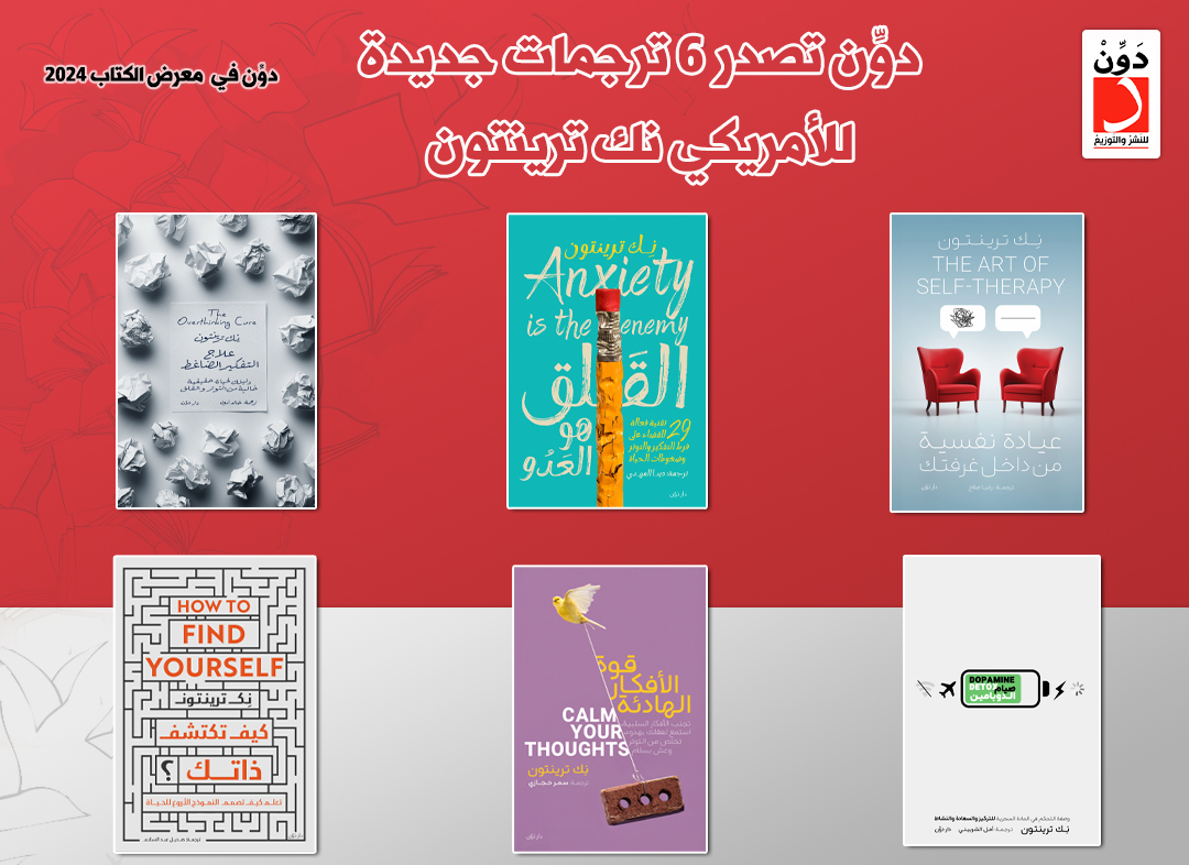 أصدرت دار دوِّن للنشر والتوزيع 6 ترجمات جديدة للكاتب نك ترينتون – nick trenton، هم: “صيام الدوبامين” ترجمة أمل الشربيني، و”علاج التفكير الضاغط” ترجمة خالد أمين، و”عيادة نفسية من داخل غرفتك” ترجمة رانيا صلاح، و”قوة الأفكار الهادئة” ترجمة سمر حجازي، و”كيف تكتشف ذاتك؟” ترجمة هديل عبد السلام، و”القلق هو العدو” ترجمة دينا المهدي. وذلك بالتزامن مع معرض القاهرة الدولي للكتاب في نسخته الـ55 لعام 2024.
